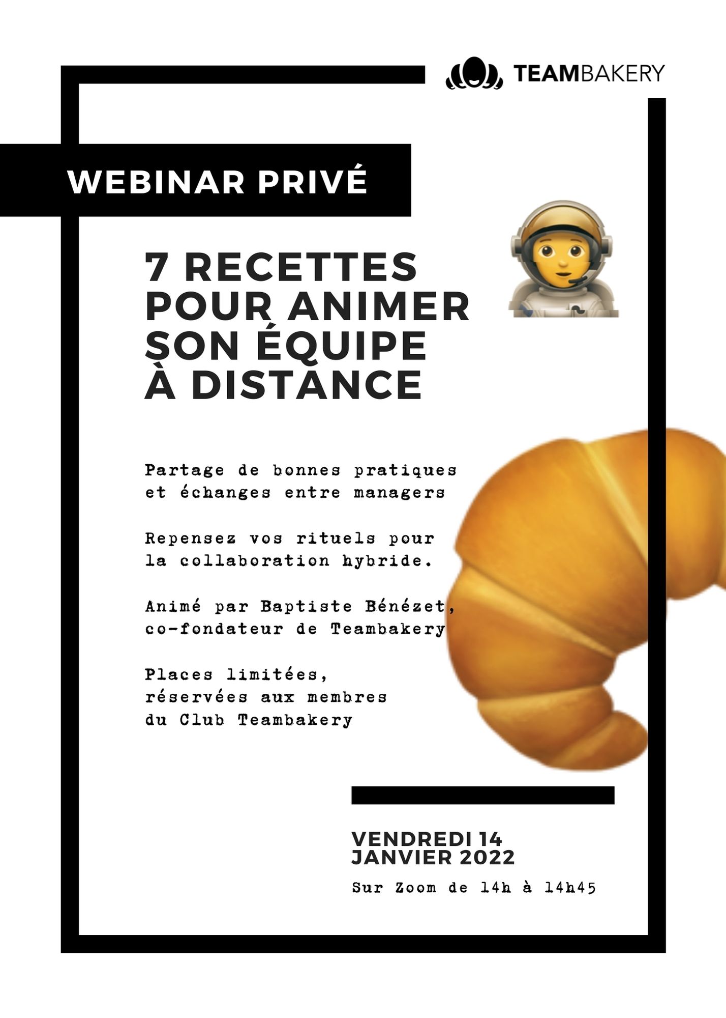 Si c’est le cas, rendez-vous le vendredi 14 janvier prochain de 14h à 14h45 pour un prise de recul collective et un partage de bonne pratiques pour recréer un cadre de travail alliant efficacité et convivialité à distance.